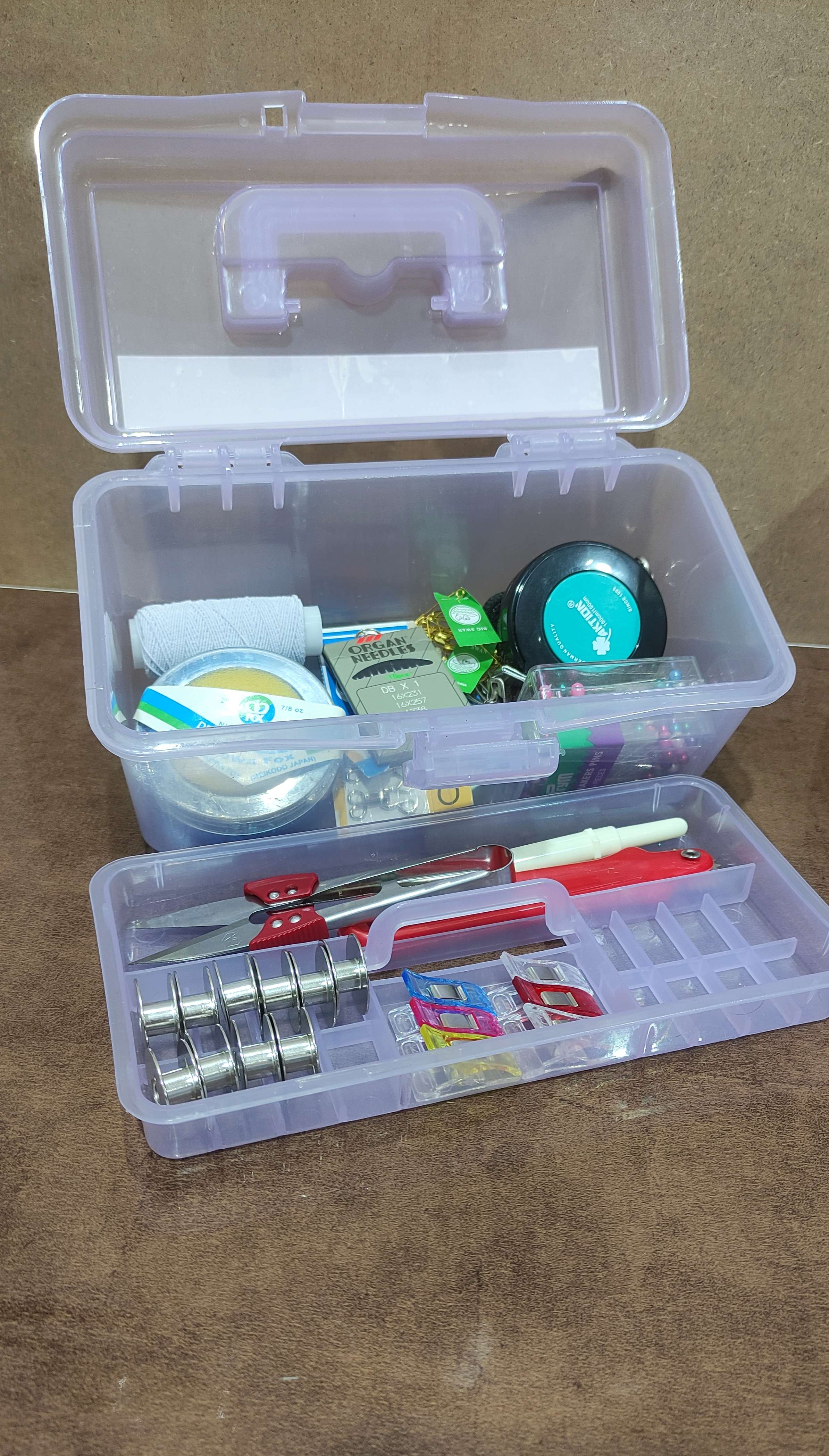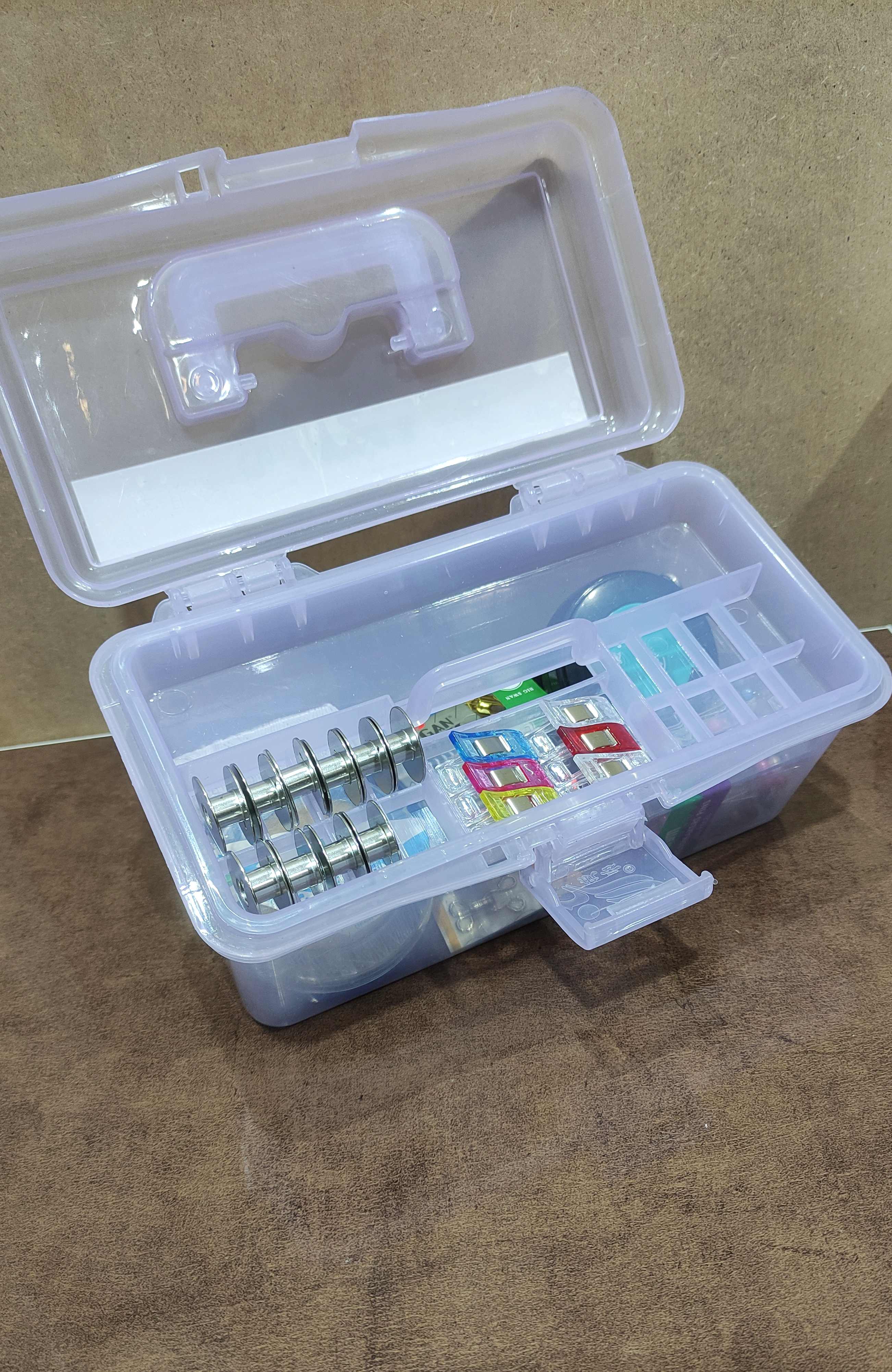 جعبه نظم دهنده لوازم خیاطی مثل بشکاف،نخ چین، رولت، سوزن، ماسوره، قزن و دکمه، متر، کش، سنجاق، نخ، گیره الگو و سایر لوازم کوچک